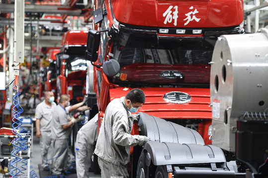 6月15日,工人在位于吉林长春的一汽解放总装车间内装配车辆。