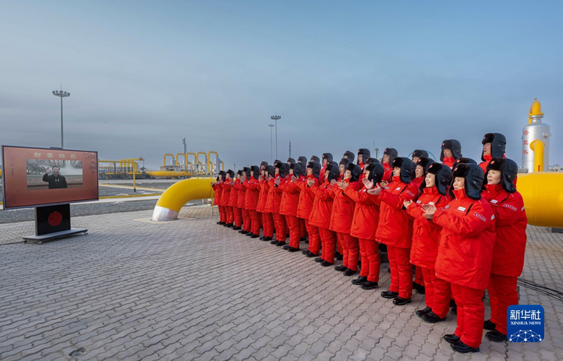 1月18日,中共中央总书记、国家主席、中央军委主席习近平在北京通过视频连线看望慰问基层干部群众,向全国各族人民致以新春的美好祝福。这是习近平通过视频连线,同塔里木油田公司轮南油气储运中心西气东输第一站克拉集气区员工亲切交流。(新华社记者 翟健岚/摄)