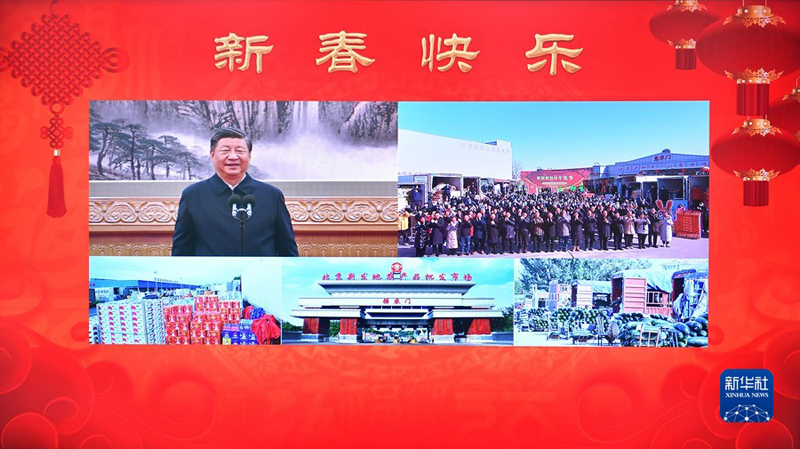 1月18日,中共中央总书记、国家主席、中央军委主席习近平在北京通过视频连线看望慰问基层干部群众,向全国各族人民致以新春的美好祝福。这是习近平通过视频连线,同北京新发地农产品批发市场的商户和采购年货的群众亲切交流。(新华社记者 申宏/摄)