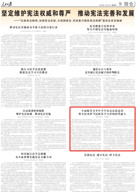 下一步,教育系统将深入贯彻习近平总书记重要指示精神,教育引导广大青少年学生成为社会主义法治的忠实崇尚者、自觉遵守者、坚定捍卫者,为实现中华民族伟大复兴作出新的更大贡献。(“弘扬宪法精神,加强宪法实施,为强国建设、民族复兴提供宪法保障”座谈会发言摘编 本文刊发于《人民日报》2023年12月07日第09版)