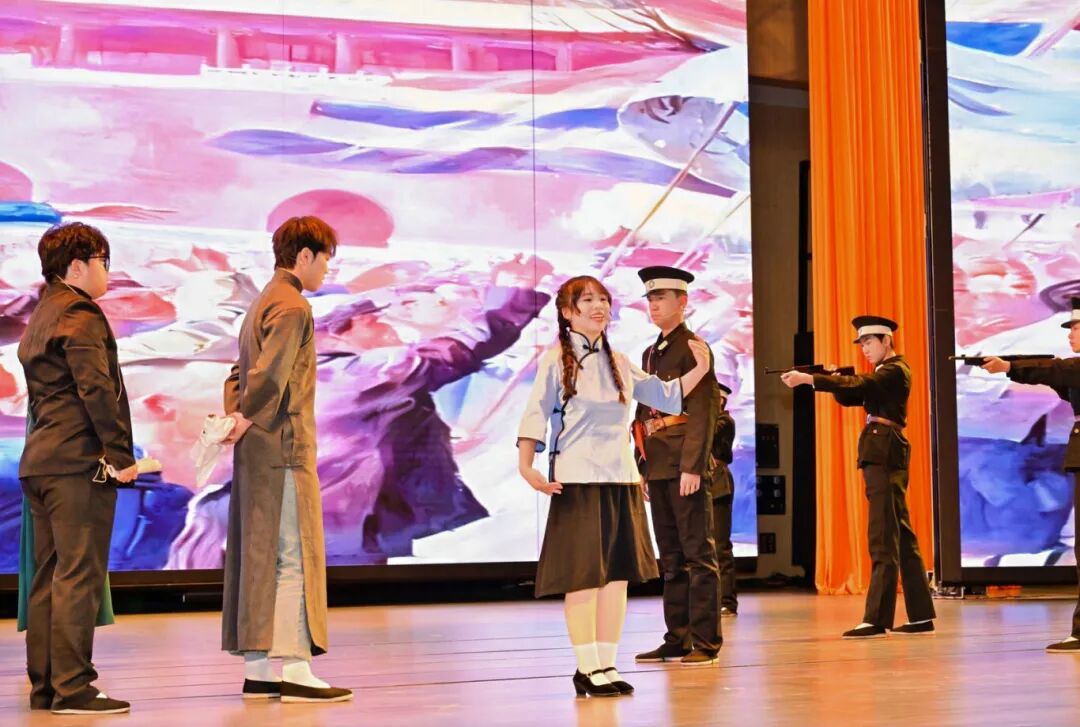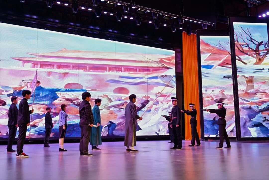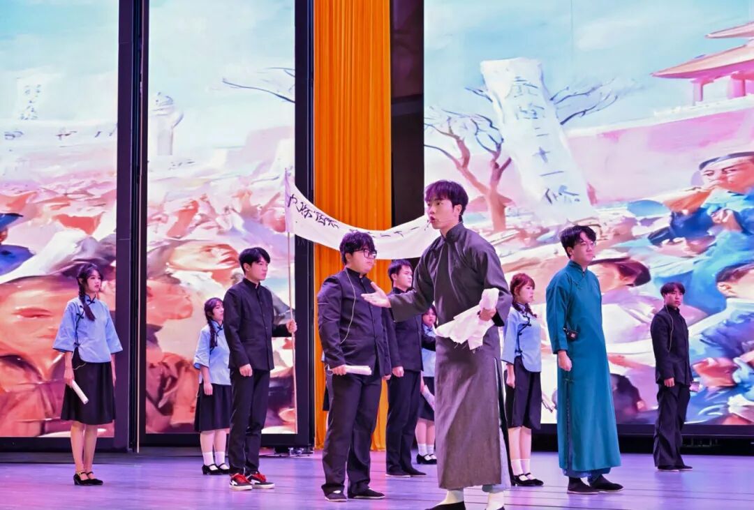 我院选送的情景剧《破晓》在第一篇章中震撼上演。该剧以“五四运动”为历史背景,生动再现了巴黎和会外交失败后,广大青年学生为外争主权、内惩国贼,毅然走上街头游行示威的爱国壮举。在常彦周、温沛老师的悉心指导下,张佳毓、罗家辉、吴鑫媛、陈怡森等同学以饱满的热情和精湛的演技,深刻刻画了青年学子在国家危难之际所展现出的觉醒与担当,剧情跌宕起伏,表演感人至深,赢得了现场观众的广泛共鸣和热烈掌声。